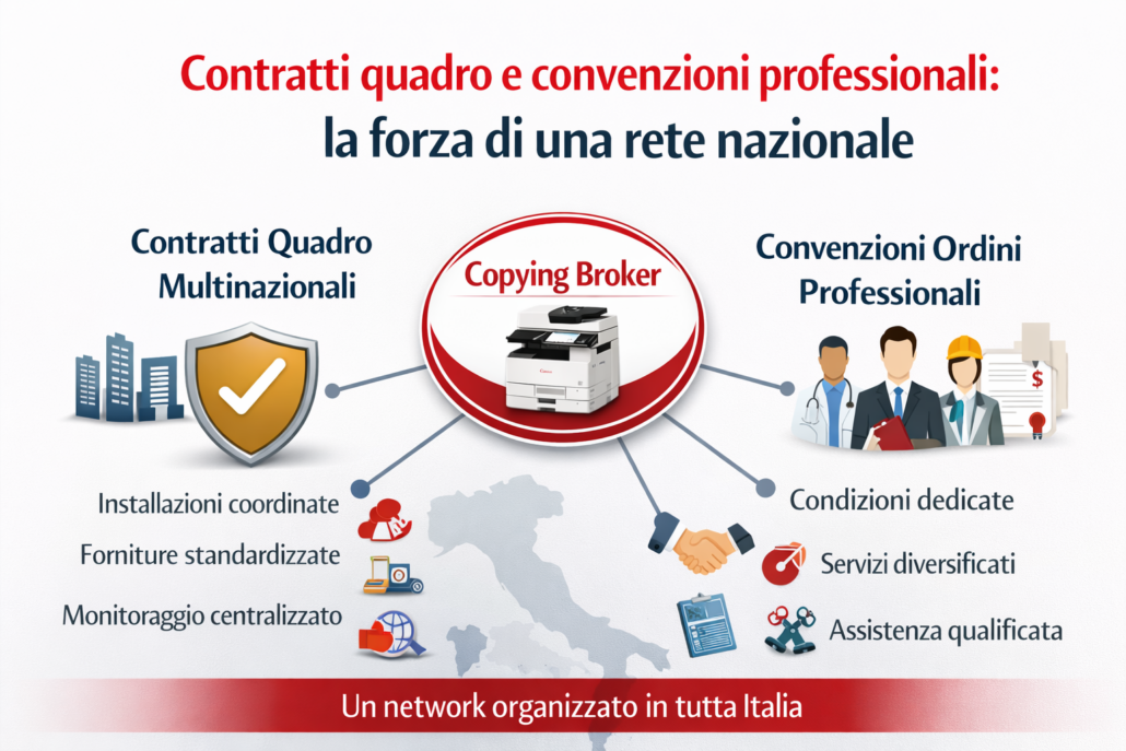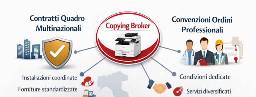 Copying Broker gestisce contratti quadro nazionali, coordinando installazioni, assistenza e monitoraggio.
